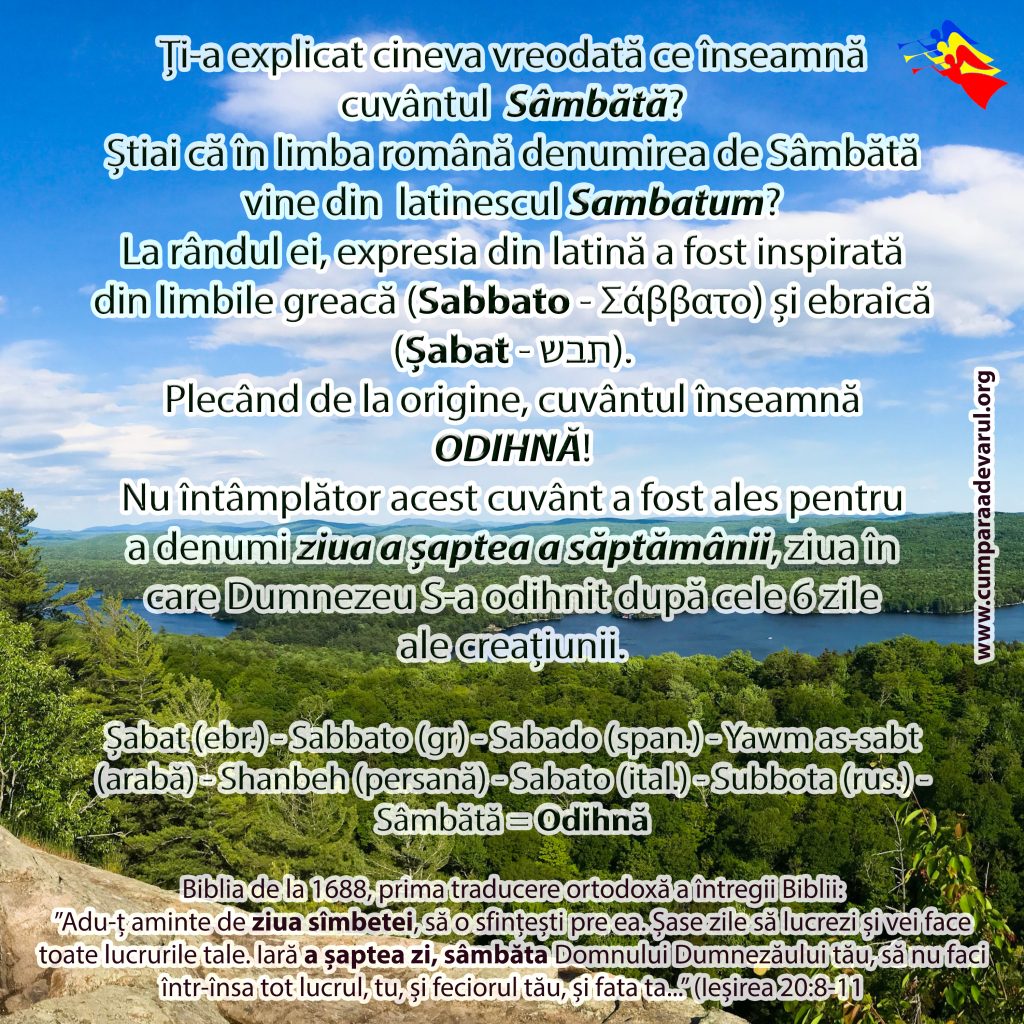 „Adu-ți aminte de ziua Sâmbetei, ca să o sfințești pe ea. Șase zile lucrează și fă toate lucrurile tale, iar ziua a șaptea este Sâmbăta, ziua Domnului Dumnezeului tău. Să nu lucrezi în ea, nici un lucru, nici tu, nici fiul tău, nici fiica ta, nici robul tău, nici roaba ta, nici dobitocul tău, nici străinul care locuiește înlăuntrul cetăților tale, că în șase zile făcut-a Domnul cerul și pământul, marea și toate câte sunt, iar în ziua a șaptea S-a odihnit. De aceea a binecuvântat Domnul ziua a șaptea și a sfințit-o.” (Ieșirea sau Exodul 20:8-11, text reprodus din Biblia ortodoxă de la 1939, tradusă de preoții profesori Vasile Radu și Gala Galaction)