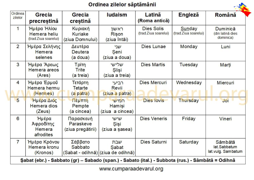 Unii se întreabă cum am ajuns la denumirile actuale pentru zilele săptămânii. Mai jos se poate vedea acest lucru: